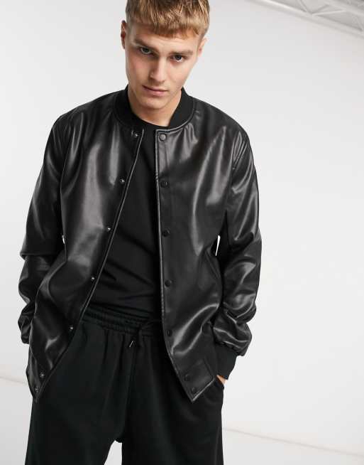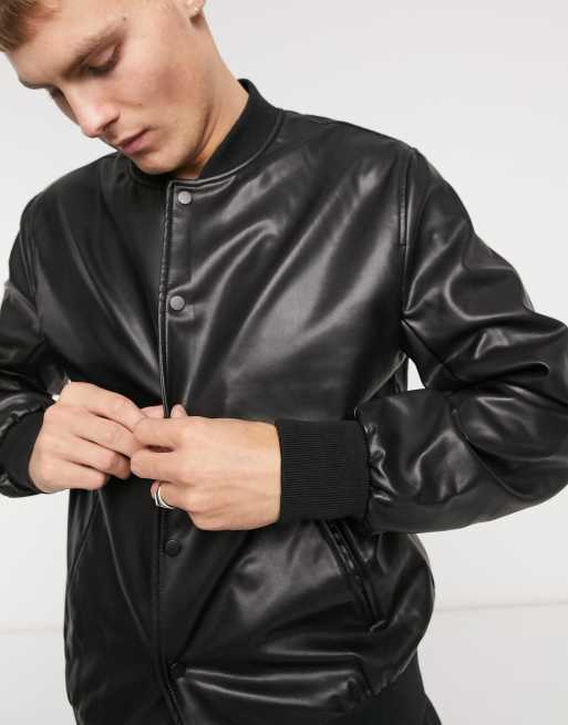 Asos Design Faux Leather Bomber Jacket In Black Asos