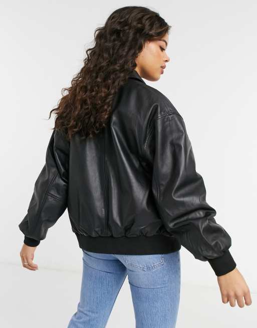 Asos Design Oversized Leather Bomber Jacket In Black Asos